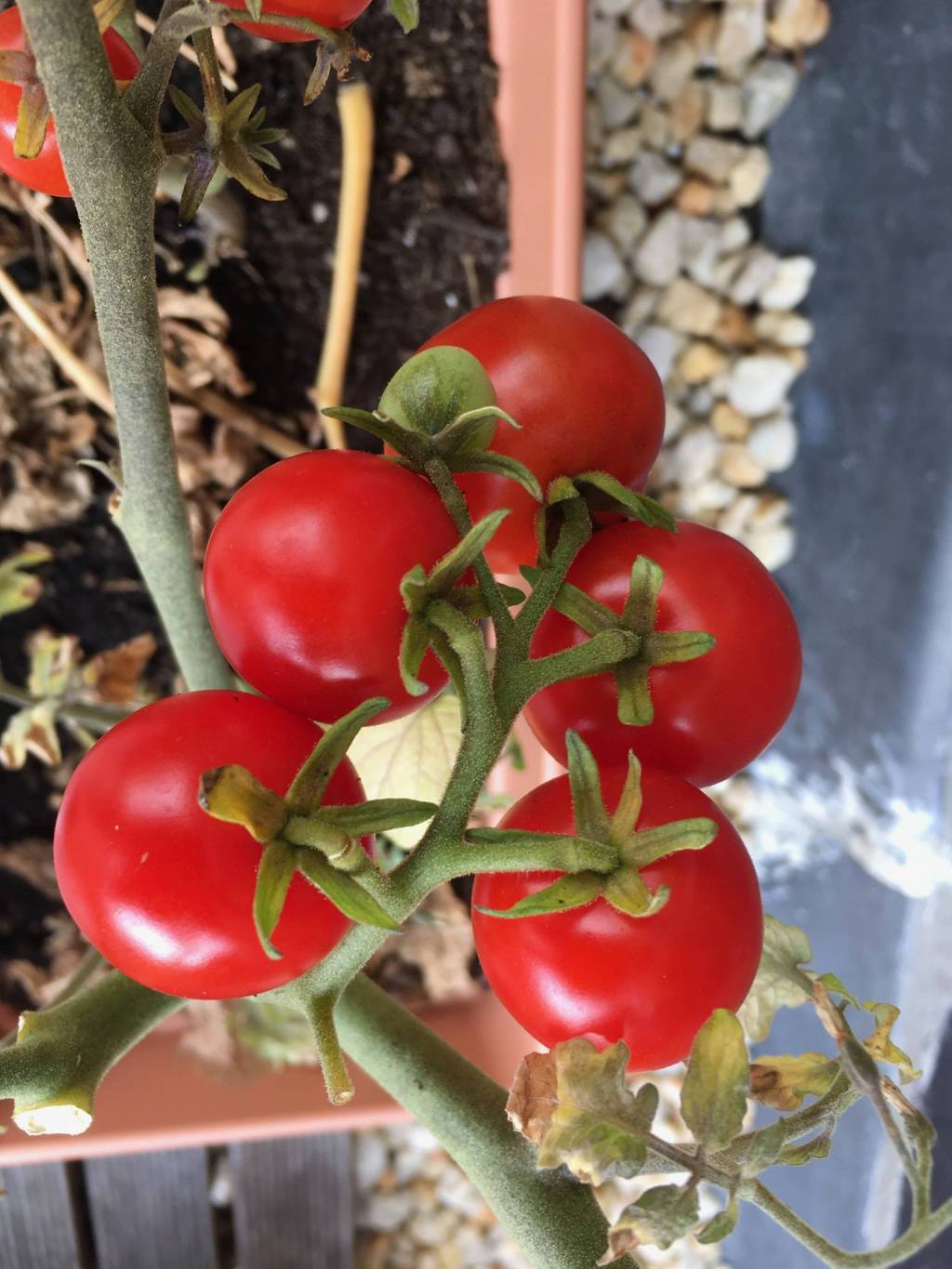 This year, I opted for dwarf tomatoes and didn’t have to prop them up, which made life quite a bit easier. It’s hard to see how tall these plants were but they were about 30cm and hardly needed any support despite being super laden with fruits.