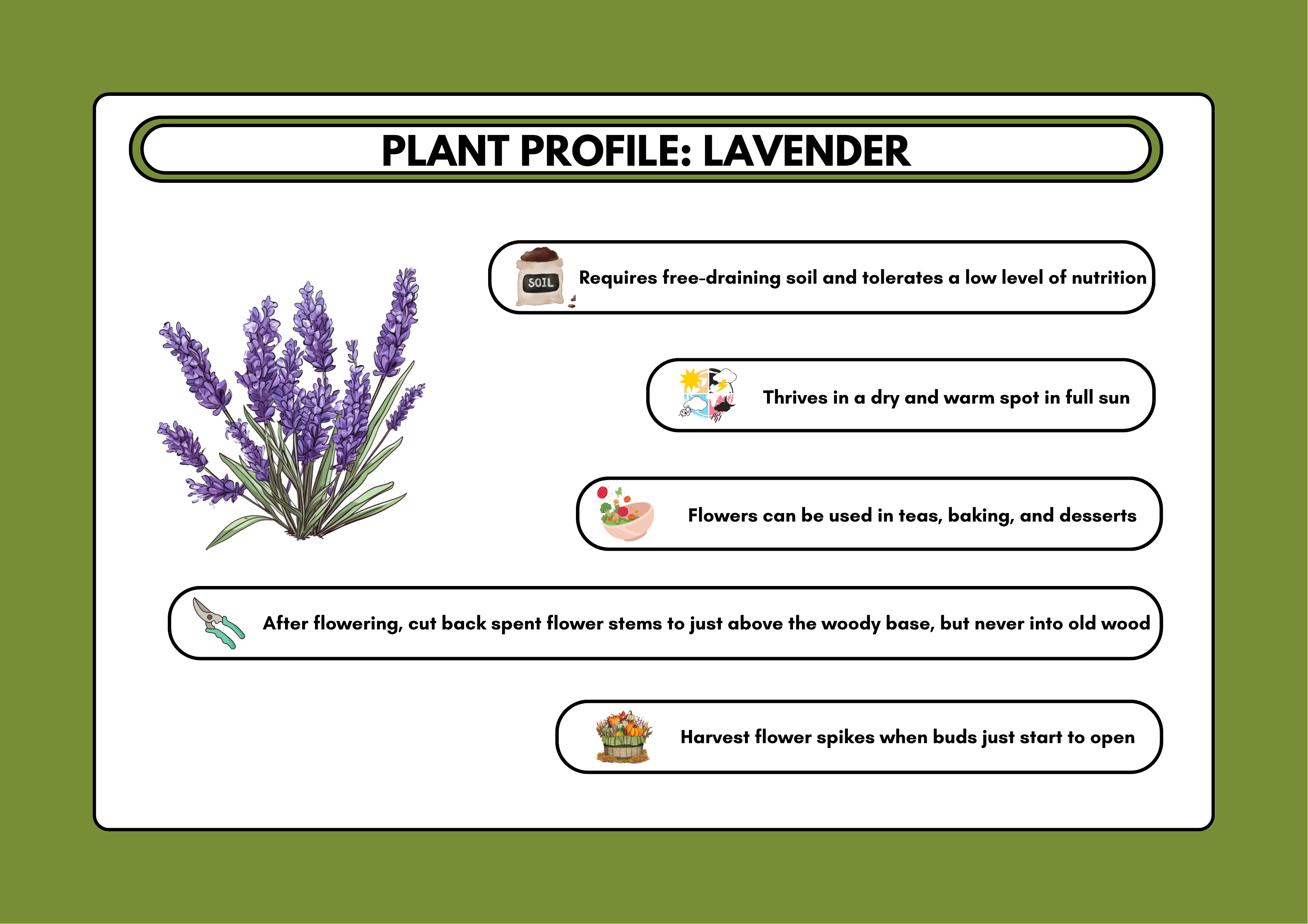 If you want a border planting plan with both scents and harvests, check out our PDF guide specifically designed for narrow borders (a slim side yard, a fence line, or a sunny wall). The intensive planting scheme combines scented lavender and sage with bigger shrubs, vines, and trees to maximise the space. The PDF also contains profiles of all the plants used. (The above illustration is the lavender sneak peek.)