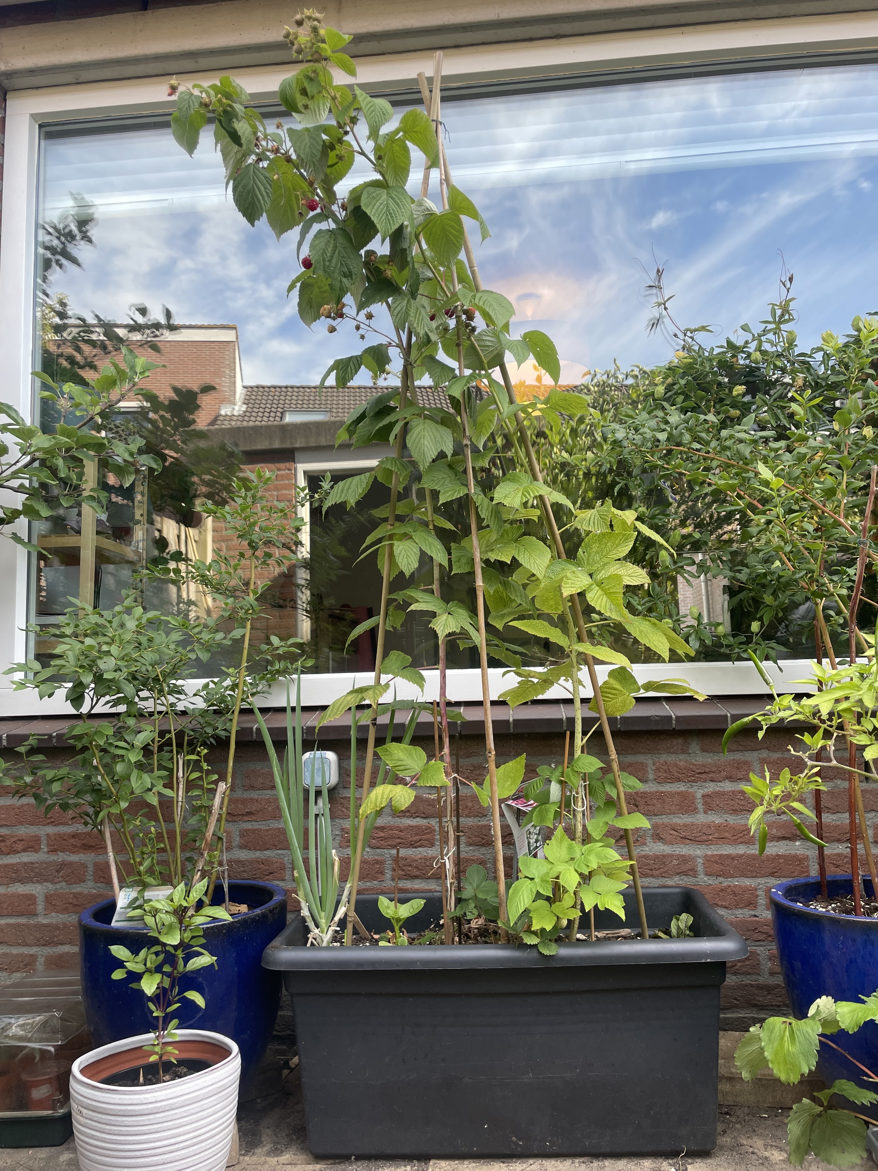 I like to move my pots around to catch the sun. But, out in the open, tall and slender plants (like raspberries) are at risk of branches being snapped by the strong autumn winds. Such winds can even topple over lightweight containers, causing serious damage to the plants within.
