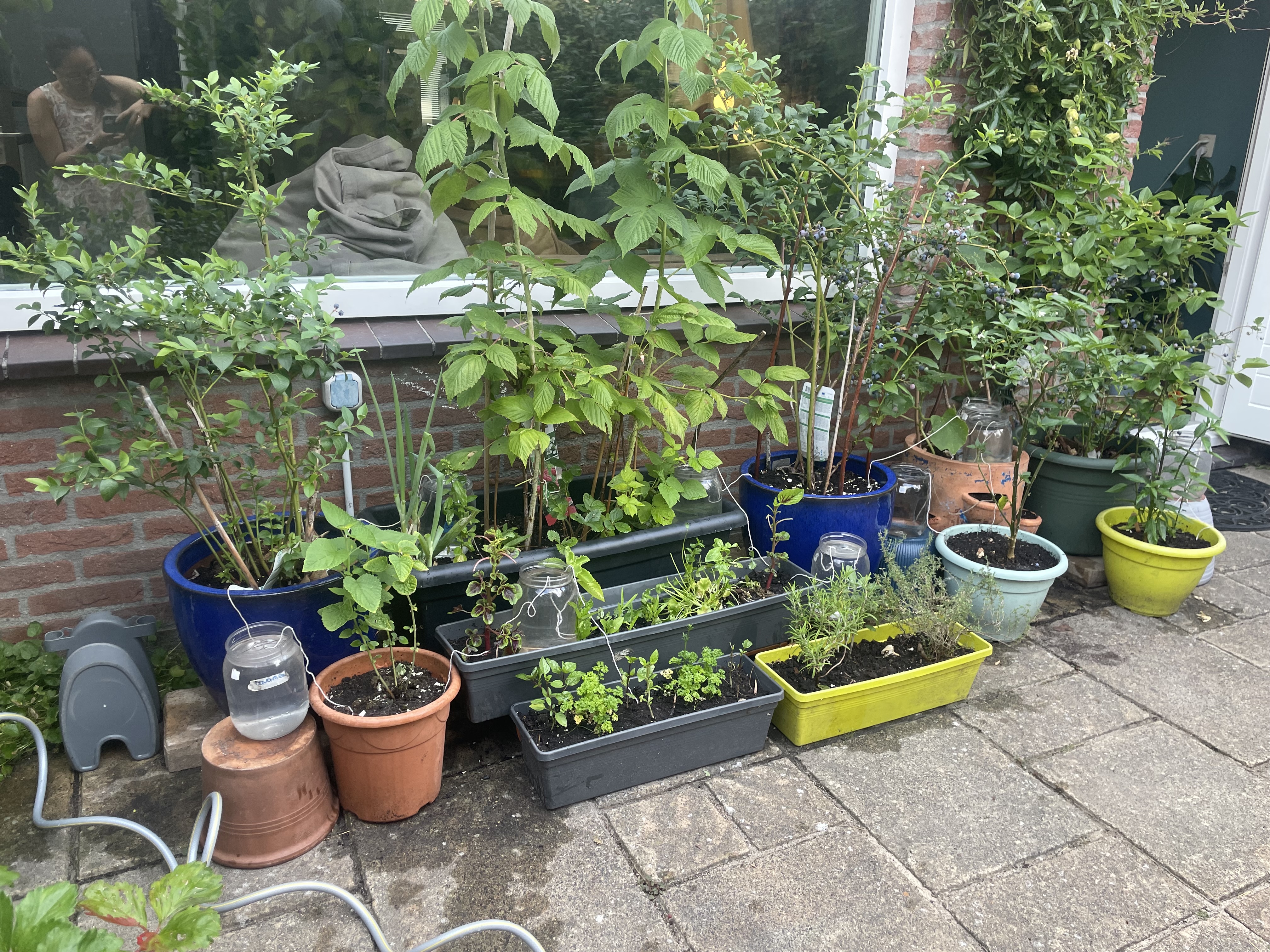 - Grouping plants into bigger containers makes better use of the space and soil capacity (aka you can grow more plants)